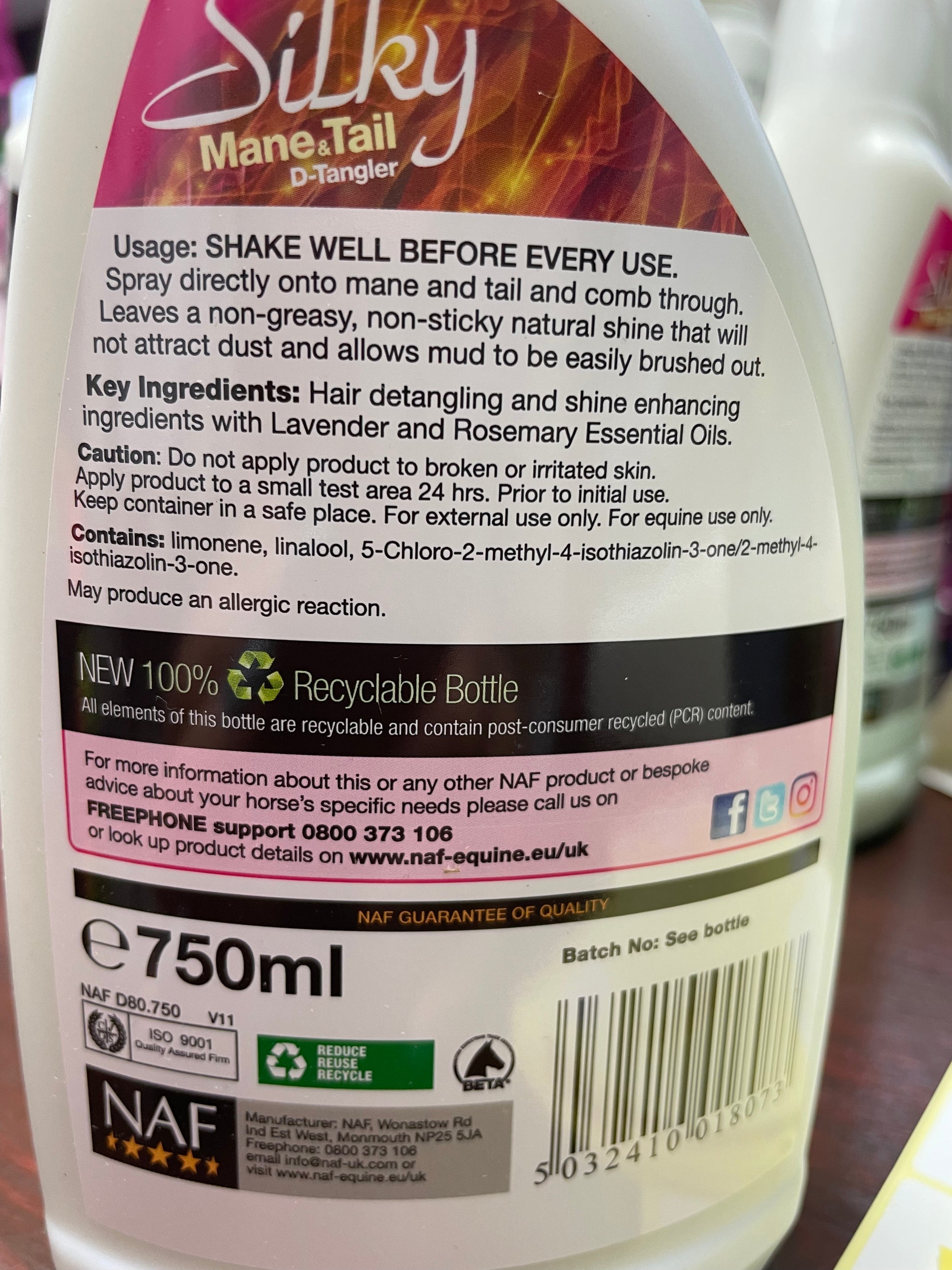 Naf silky mane and tail deranged in handy 750ml spray bottle.