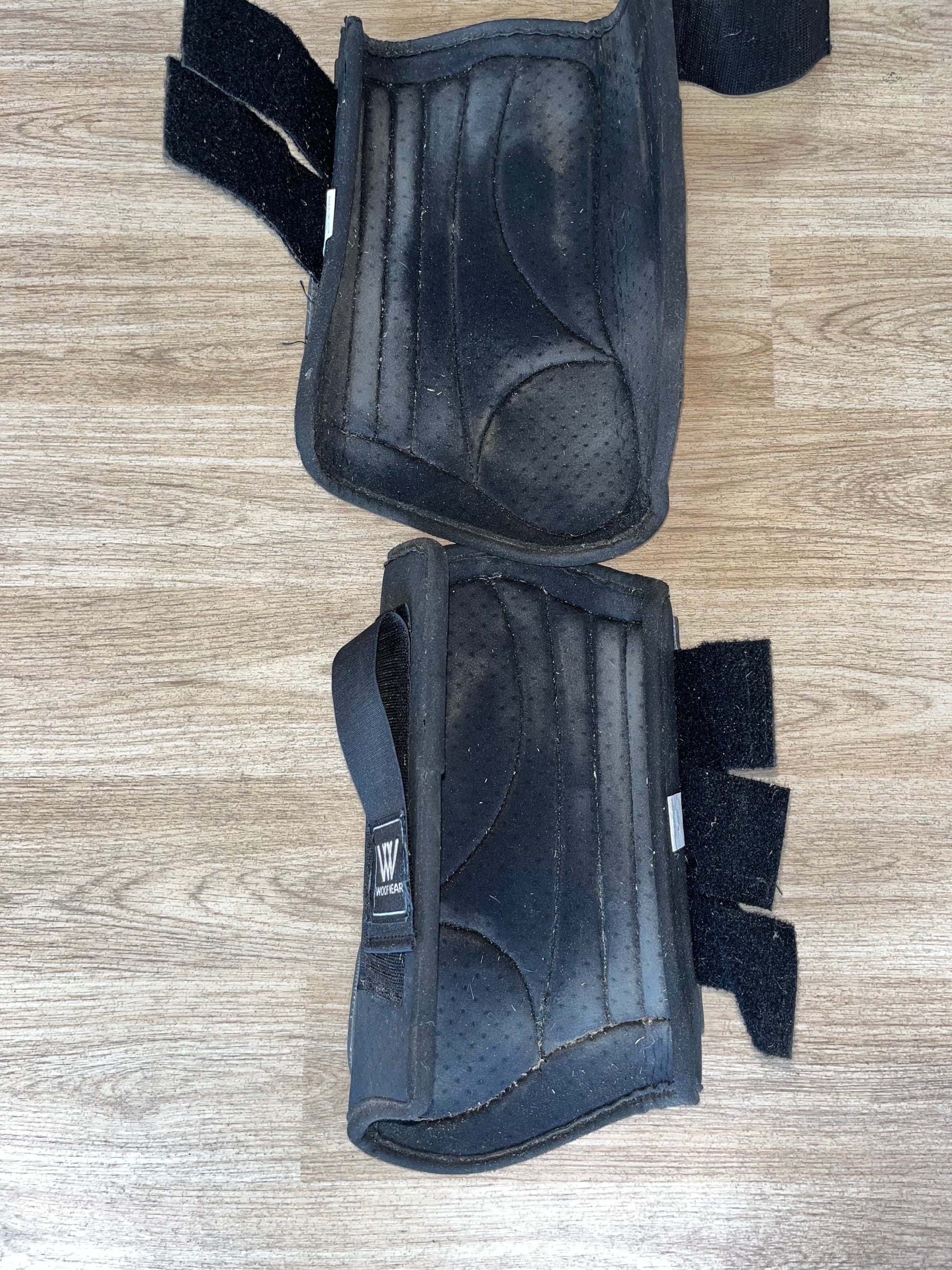 Does have signs of being used hair and some marks from being used . One small split does not effect use . Loads of life left . Woof wear brushing boots large black , Velcro fasteners.